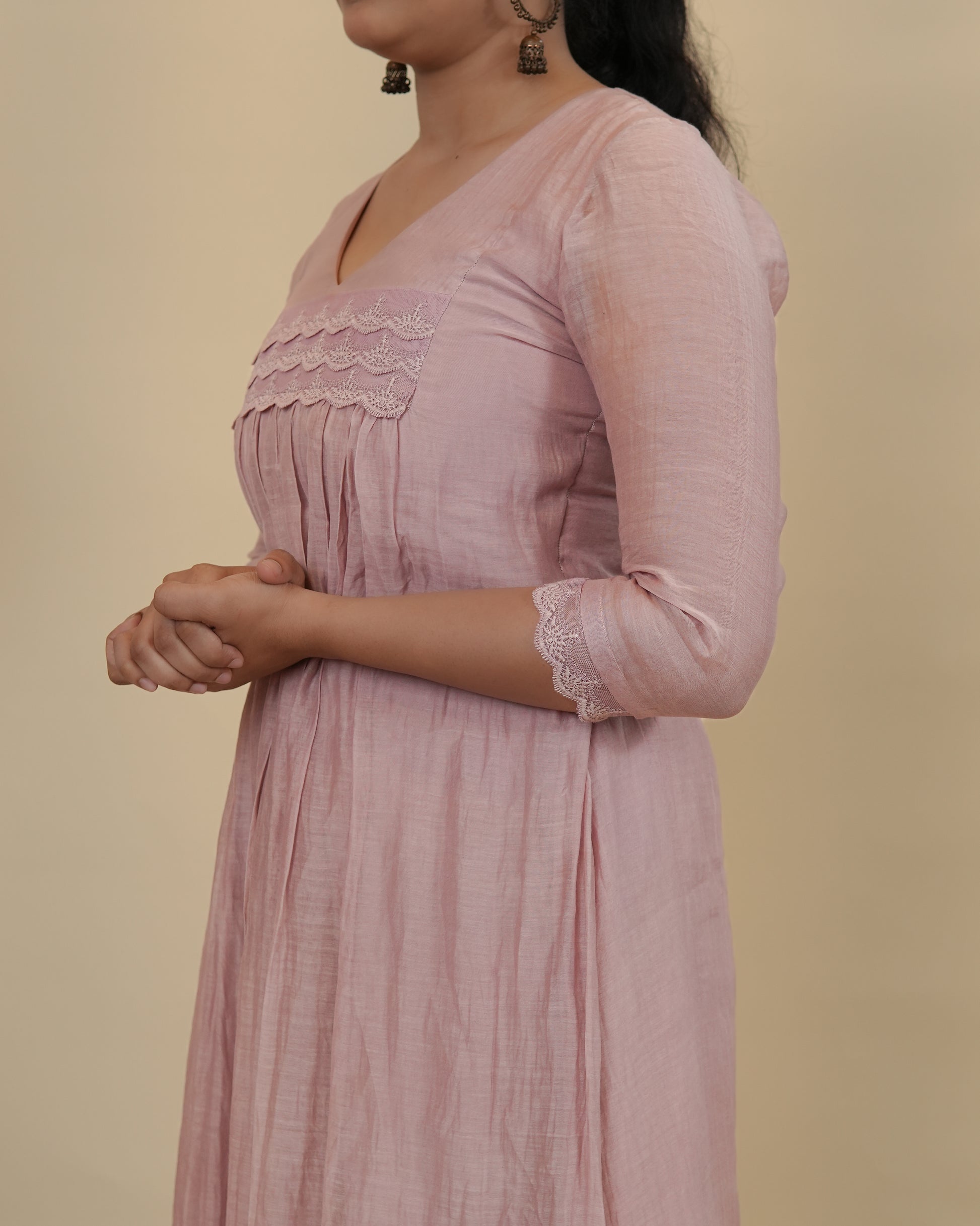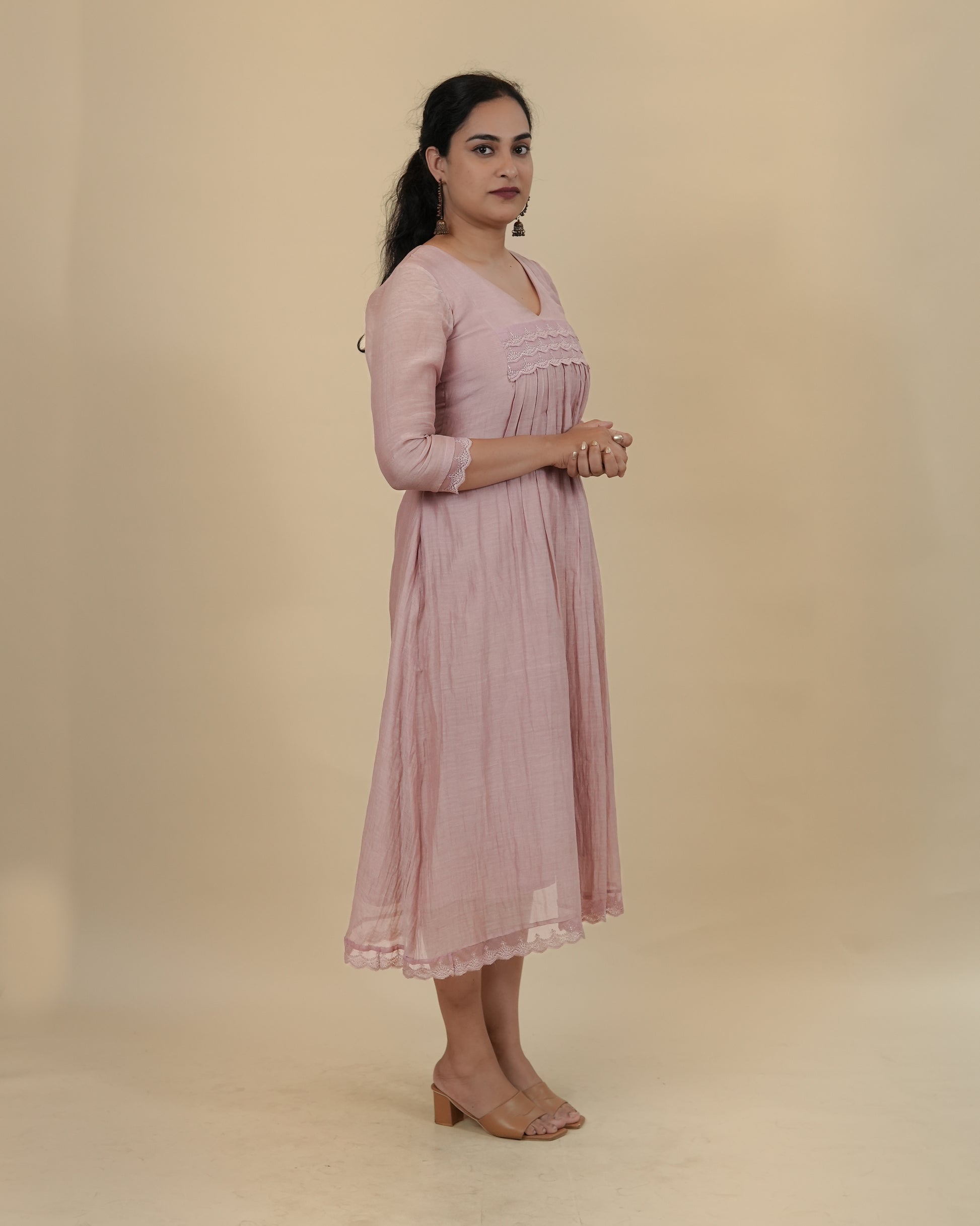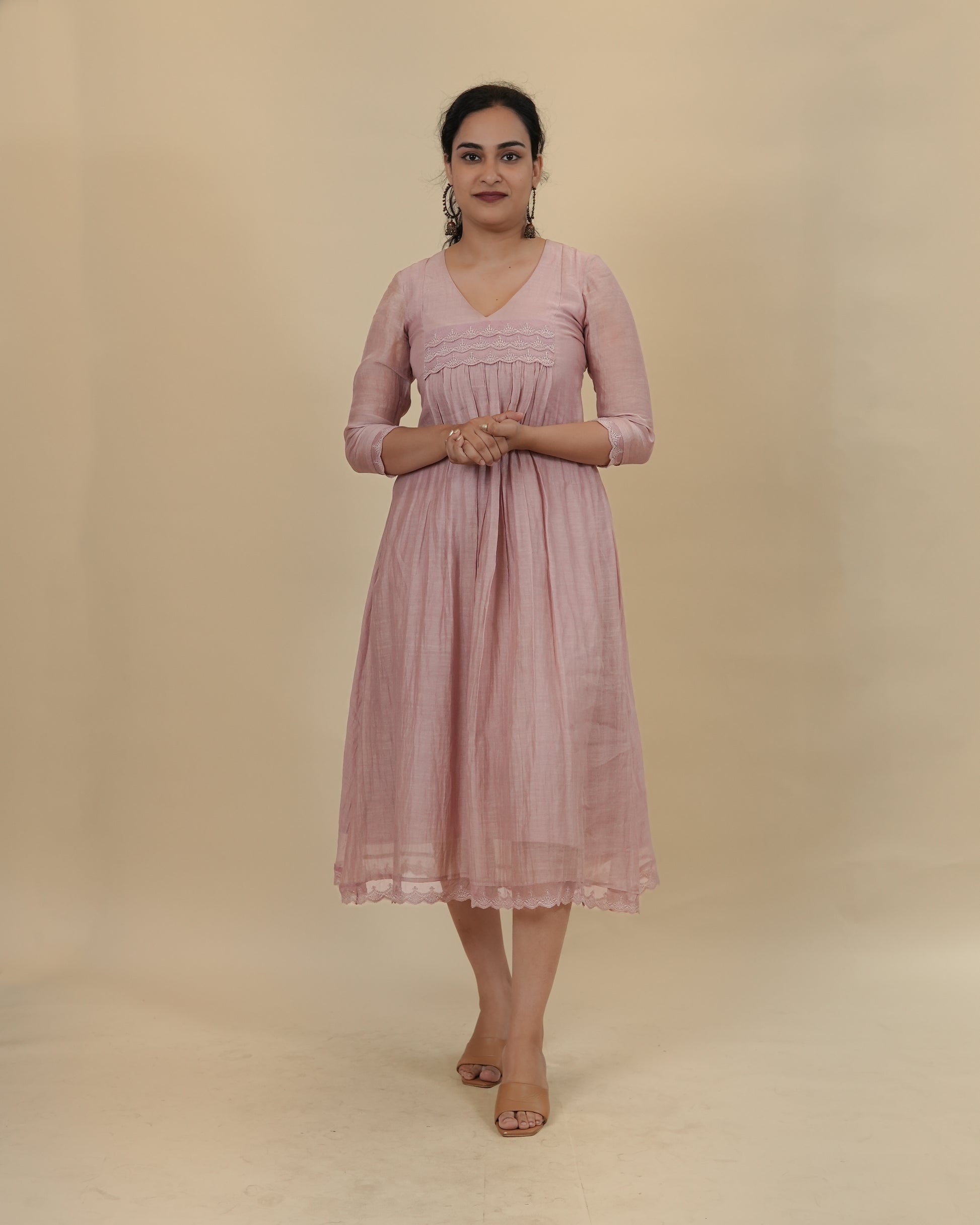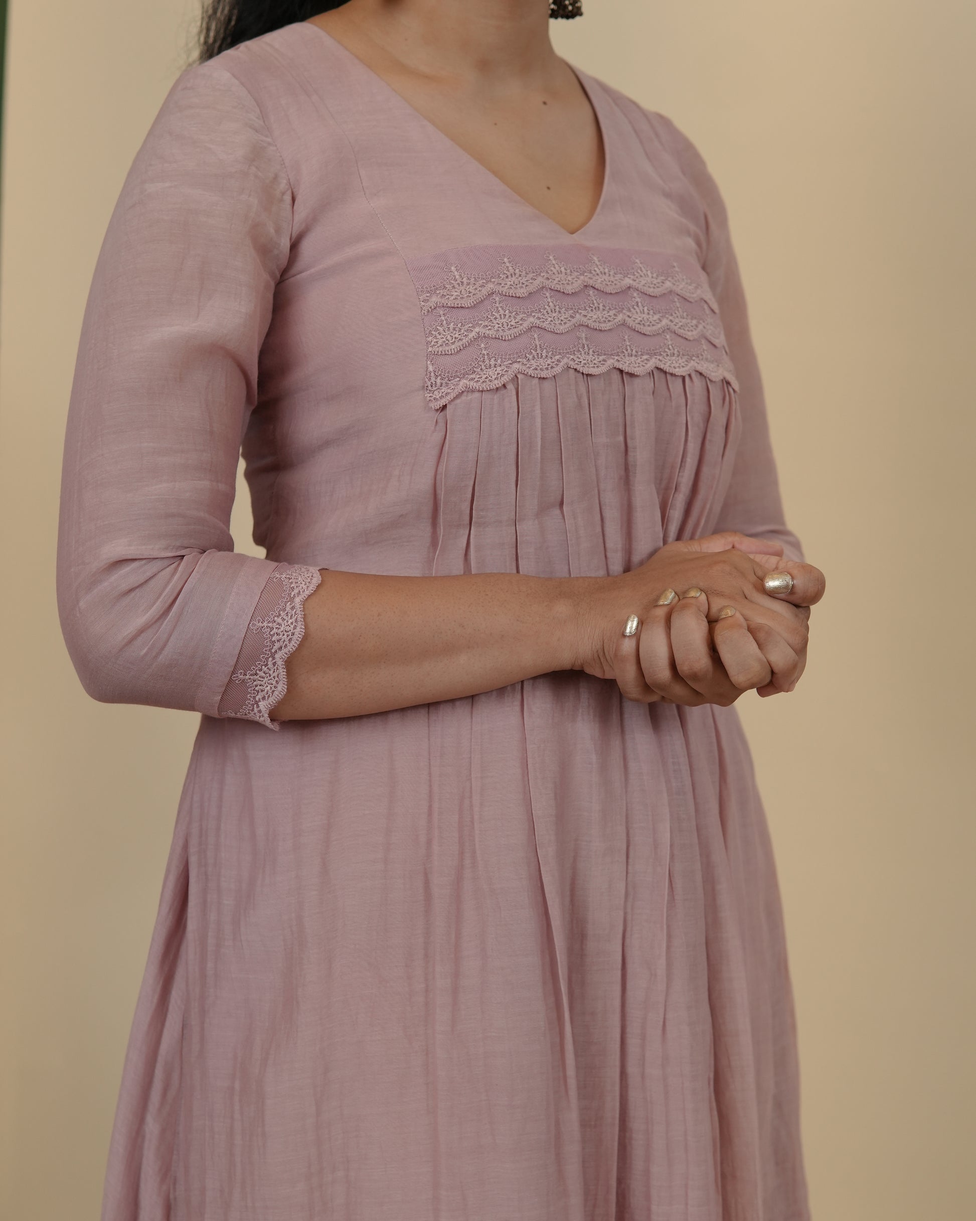This mauve chanderi dress features a delicate lace detail and a flattering v-neckline. Lightweight and elegant, this dress is perfect for any occasion. Embrace effortless style with this must-have piece.